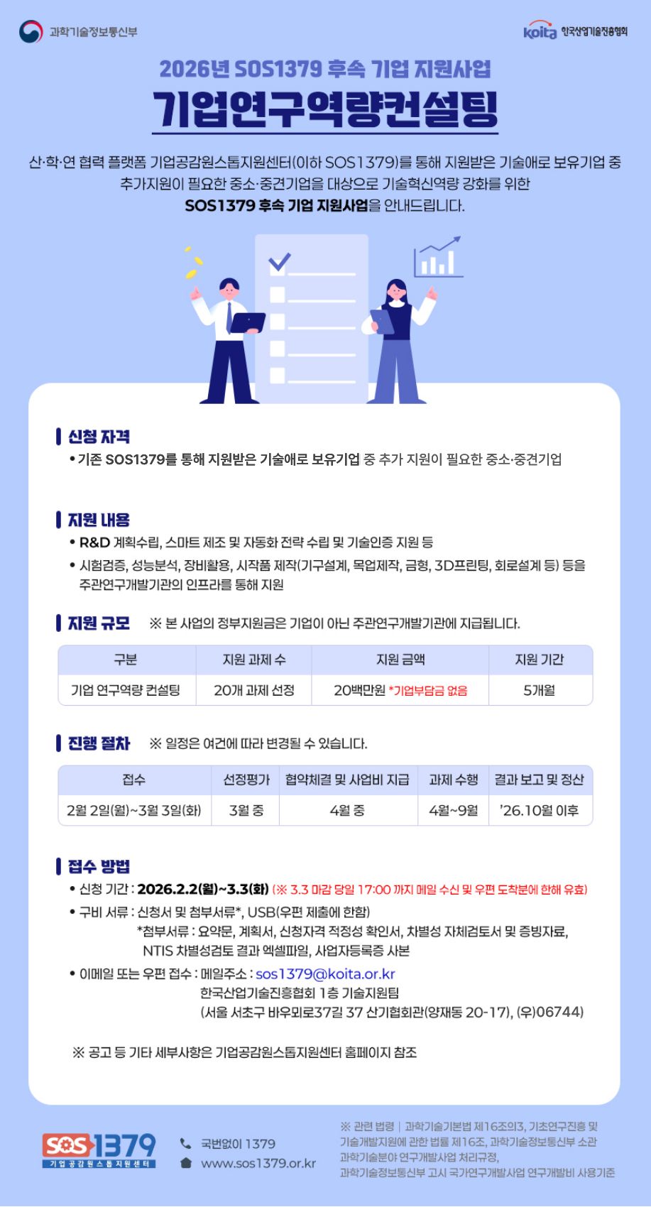 2026년 기업공감원스톱지원센터 후속 기업 지원사업(기업 연구역량 컨설팅) 신청접수 안내 기업공감원스톱지원센터(SOS1379)에서는 SOS1379를 통해 지원받은 이력이 있는 기술애로 보유 기업 중 후속 지원이 필요한 중소·중견기업을 대상으로 기술혁신 역량 강화를 위한 기업 연구역량 컨설팅을 진행합니다. 본 공고는 기업공감원스톱지원센터 홈페이지(www.sos1379.or.kr) 등을 통해 별도 게재될 예정이며, 추진일정은 변동될 수 있습니다. 《 2026년 기업 연구역량 컨설팅 안내 》 □ 신청자격 - SOS1379 활용이력이 있는 중소·중견기업 중 R&D계획 수립, 스마트제조 및 자동화 전략수립, 기술인증 지원, 시험검증 등이 필요한 기업 ※ 1개 기업 당 1개의 기술수요 원칙 ※ 전문가 매칭이 필요한 경우 기업공감원스톱지원센터(국번없이1379)를 통해 문의 □ 지원내용 ○ R&D계획 수립, 스마트제조 및 자동화 전략수립, 기술인증 지원 등 ○ 시험검증, 성능분석, 장비활용, 시작품 제작(기구설계, 목업제작, 금형, 3D프린팅, 회로설계 등) 등을 주관연구개발기관의 인프라를 통해 지원 □ 지원규모 : 20백만원 x 20개 과제 (※기업부담금 없음) ※ 본 사업의 정부지원금은 기업이 아닌 주관연구개발기관에 지급 □ 지원기간 : 5개월 □ 선정기준 ○ 목표 및 명확성(20) : 기술개발목표와 내용, 기술개발 명확성 ○ 사업수행 능력(35) : 기술애로 수요반영 여부, 신청기업과 전문가 연계의 적합성, 전문가의 역량(필요한 인력 및 장비 등 확보 여부 등), 주관기관의 역량(보유기술, 유사사업 운영실적 등) ○ 개발전략(30) : 기술애로 해결방법, 기술개발방법 ○ 기대효과(10) : 사업화 계획, 파급 효과 ○ 사업비(5) : 사업비 구성의 적절성, 사업비 집행 계획의 투명성 □ 진행절차 ○ 신청서 작성 : 전문가 사전협의, 기업-전문가 협업 계획수립 ○ 접수 : 이메일 또는 우편 제출 ○ 선정평가 : 지원과제 선정평가 및 결과 통보 ○ 협약체결 및 사업비 지급 : SOS1379-주관연구개발기관 협약 체결 ○ 과제 수행 : 주관연구개발기관 기술지원 수행 ○ 결과보고 및 정산 : 지원금 정산 및 사업평가, 최종보고서 작성 □ 신청기간 ○ 2026. 2. 2.(월) ~ 3. 3.(화) (마지막날 17:00시까지 제출 분에 한함) □ 신청방법 : 이메일 또는 우편 접수 ○ 연구개발계획서 및 첨부서류*, USB 1개(우편 제출에 한함) *첨부서류: 요약문, 계획서, 신청자격 적정성 확인서, 차별성 자체검토서 및 증빙자료, NTIS 차별성검토 결과 엑셀 파일, 사업자등록증(신청기업)사본 ○ 접수처 - 메일 주소: sos1379@koita.or.kr - 우편 주소: 한국산업기술진흥협회 1층 기술지원팀(서울 서초구 바우뫼로37길37산기협회관(양재동20-17), (우)06744) □ 참고사항 ○ 관련 법령 - 과학기술기본법 제16조의3 - 기초연구진흥 및 기술개발지원에 관한 법률 제16조 - 과학기술정보통신부 소관 과학기술분야 연구개발사업 처리규정 - 과학기술정보통신부 고시 국가연구개발사업 연구개발비 사용 기준 □ 기타 유의사항