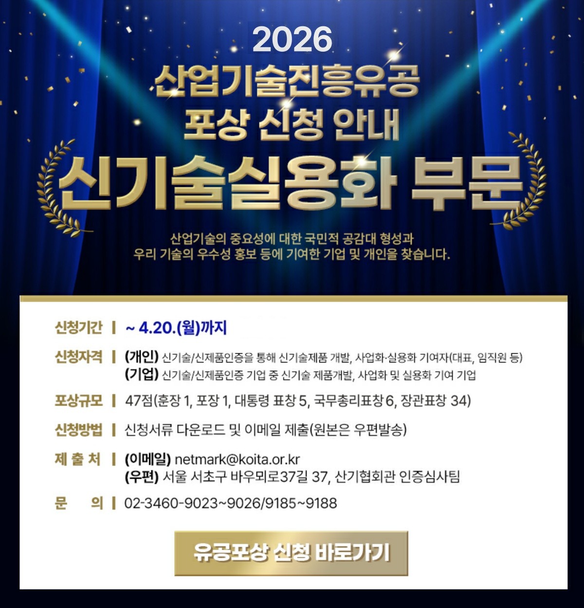 내용신기술(NET) / 신제품(NEP) 인증을 통해 우수한 혁신기술 개발과 실용화에 공이 큰 기술인 및 기업(기관)을 대상으로 □ 포상부문: 산업기술진흥유공 신기술실용화 부문 □ 포상규모: 47점(산업훈장 1점, 산업포장 1점, 대통령표창 5점, 국무총리표창 6점, 산업통상부 장관표창 34점) □ 신청자격 ○ (유공자) 신기술/신제품 인증을 통해 신기술 제품 개발, 사업화 및 실용화 기여자(대표, 임직원 등) ○ (유공기업) 신기술/신제품 인증기업 중 신기술 제품 개발, 사업화 및 실용화 기여 기업 □ 신청기간: 2026년 3월 19일(목) ~ 4월 20일(월) 18:00까지