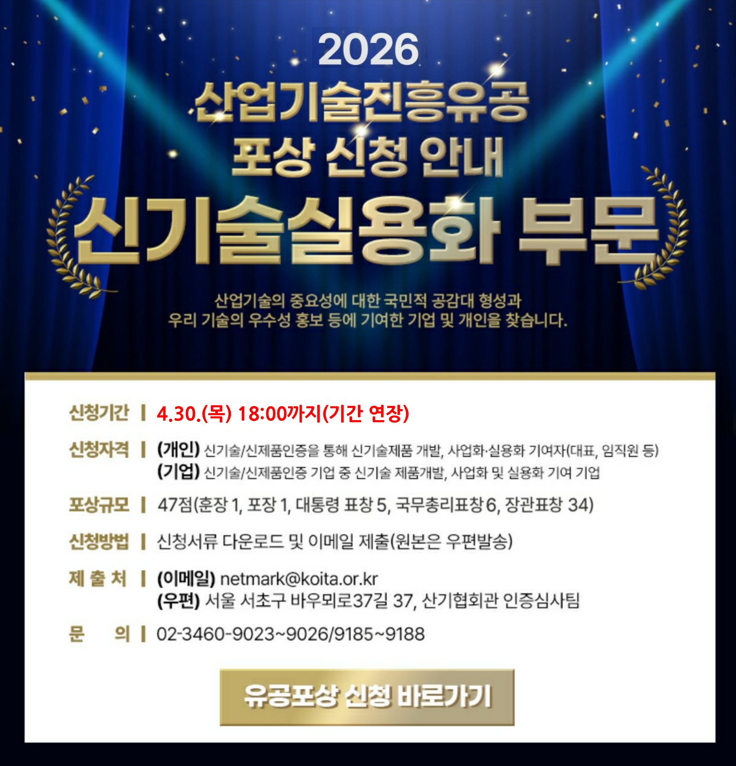 내용신기술(NET) / 신제품(NEP) 인증을 통해 우수한 혁신기술 개발과 실용화에 공이 큰 기술인 및 기업(기관)을 대상으로 □ 포상부문: 산업기술진흥유공 신기술실용화 부문 □ 포상규모: 47점(산업훈장 1점, 산업포장 1점, 대통령표창 5점, 국무총리표창 6점, 산업통상부 장관표창 34점) □ 신청자격 ○ (유공자) 신기술/신제품 인증을 통해 신기술 제품 개발, 사업화 및 실용화 기여자(대표, 임직원 등) ○ (유공기업) 신기술/신제품 인증기업 중 신기술 제품 개발, 사업화 및 실용화 기여 기업 □ 신청기간: 2026년 3월 19일(목) ~ 4월 30일(목) 18:00까지