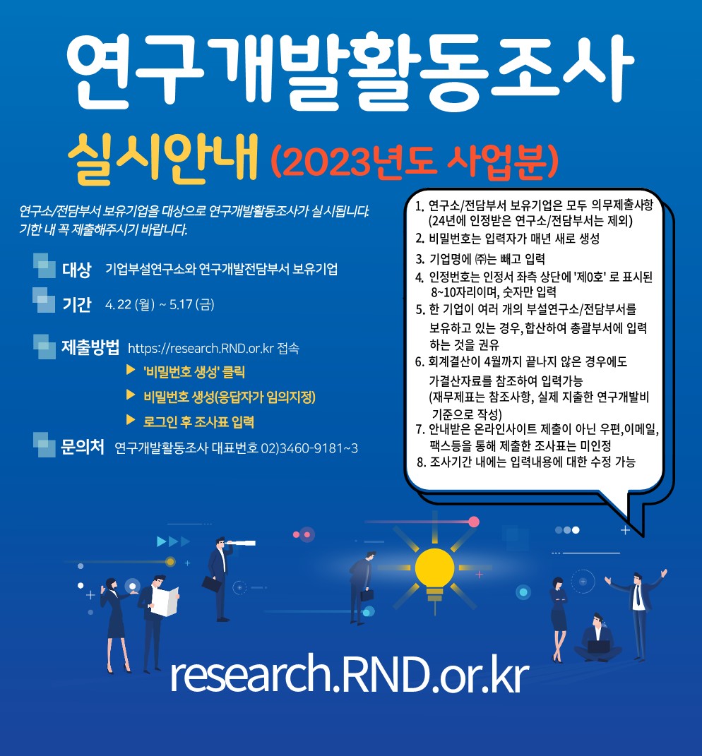 | [공고] 2023년도(조사대상 연도기준) 연구개발활동조사 기업부문 안내 | |||