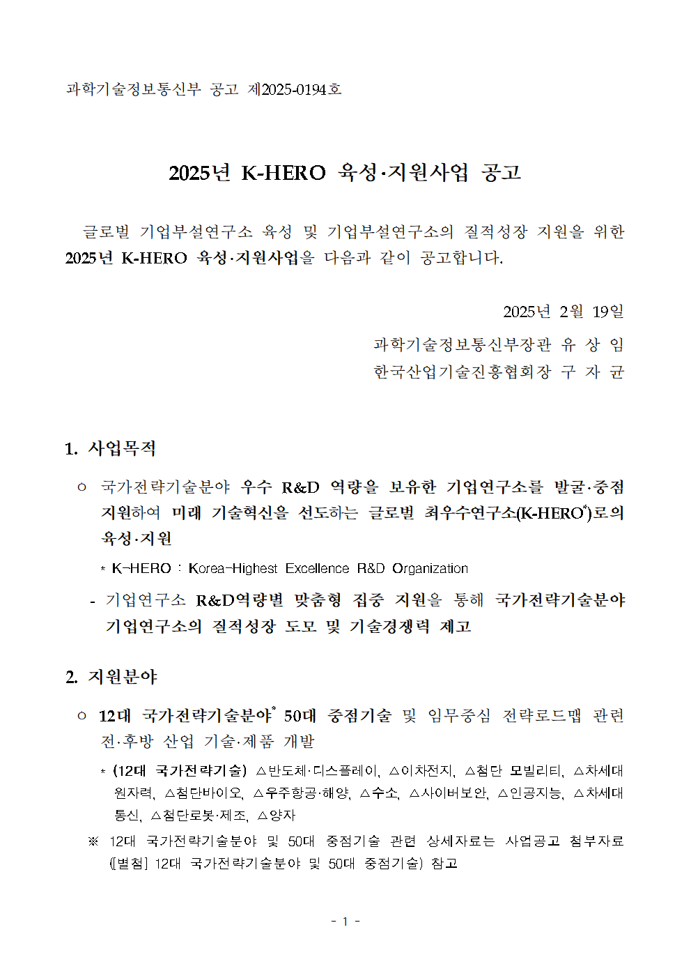 | 2025년 K-HERO 육성·지원사업 사업공고 | |||