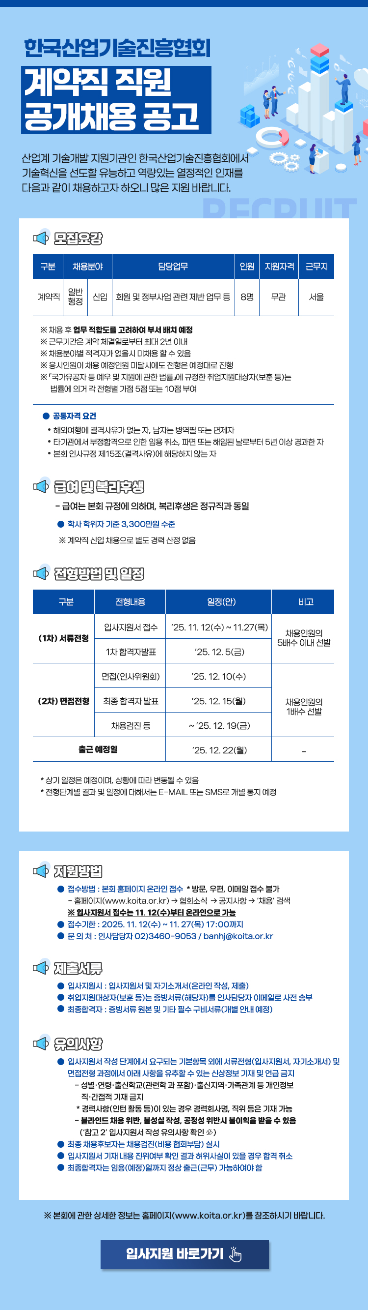 | [채용] 2025년 하반기 한국산업기술진흥협회 계약직 직원 공개채용 | |||