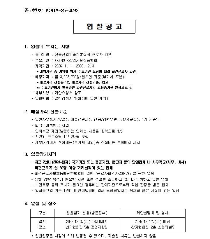 | [입찰공고] 2026년 한국산업기술진흥협회 근로자 파견업체 입찰공고 | |||