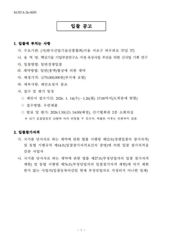 | [입찰공고] 핵심기술 기업부설연구소 지정육성사업 기획 연구용역 | |||