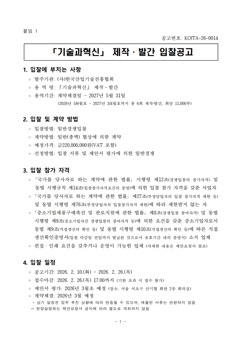 | [입찰공고] 「기술과혁신」 제작·발간 입찰 공고 | |||