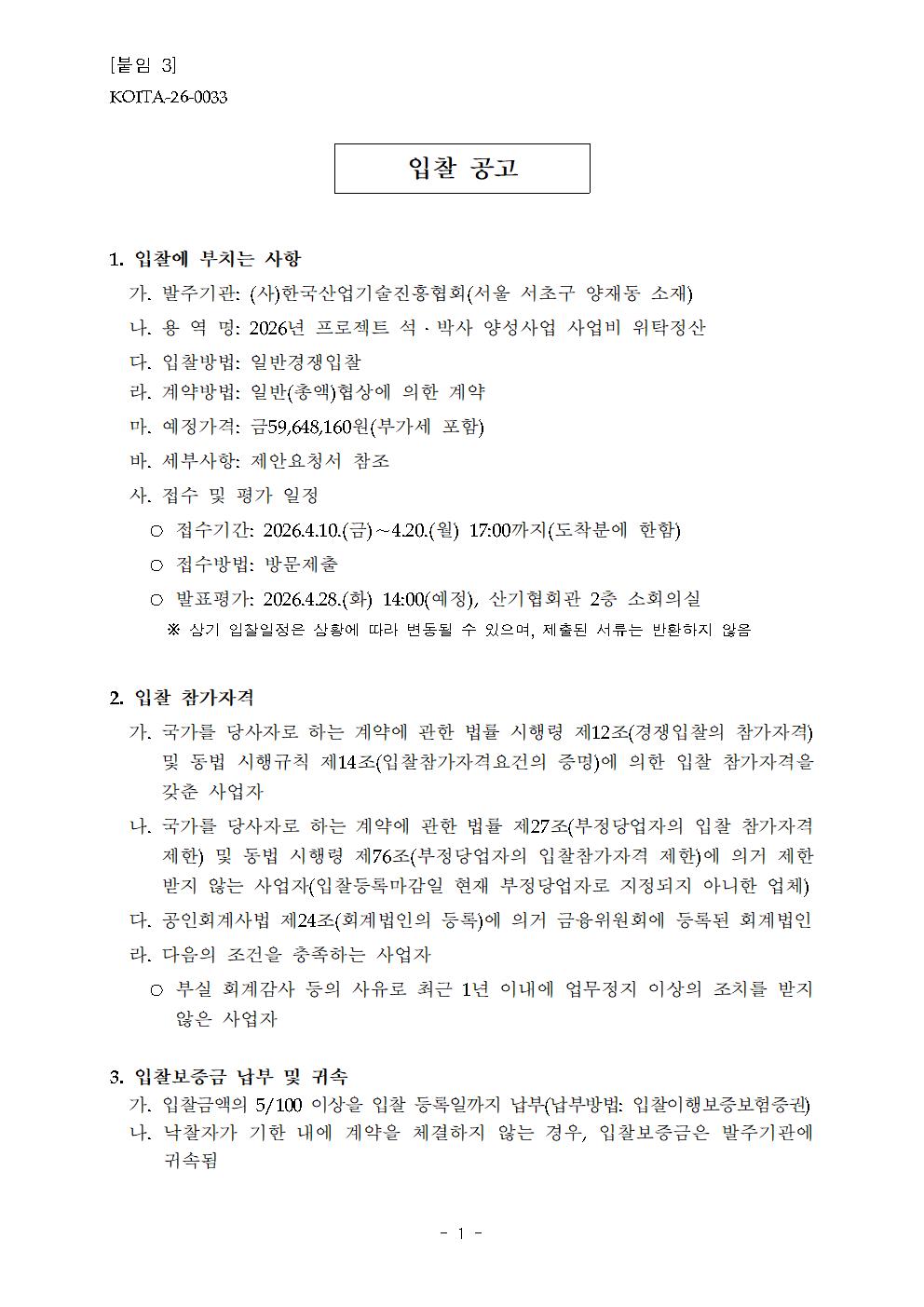 | [입찰공고] 2026년 프로젝트 석·박사 양성사업 사업비 위탁정산기관 입찰 공고 | |||