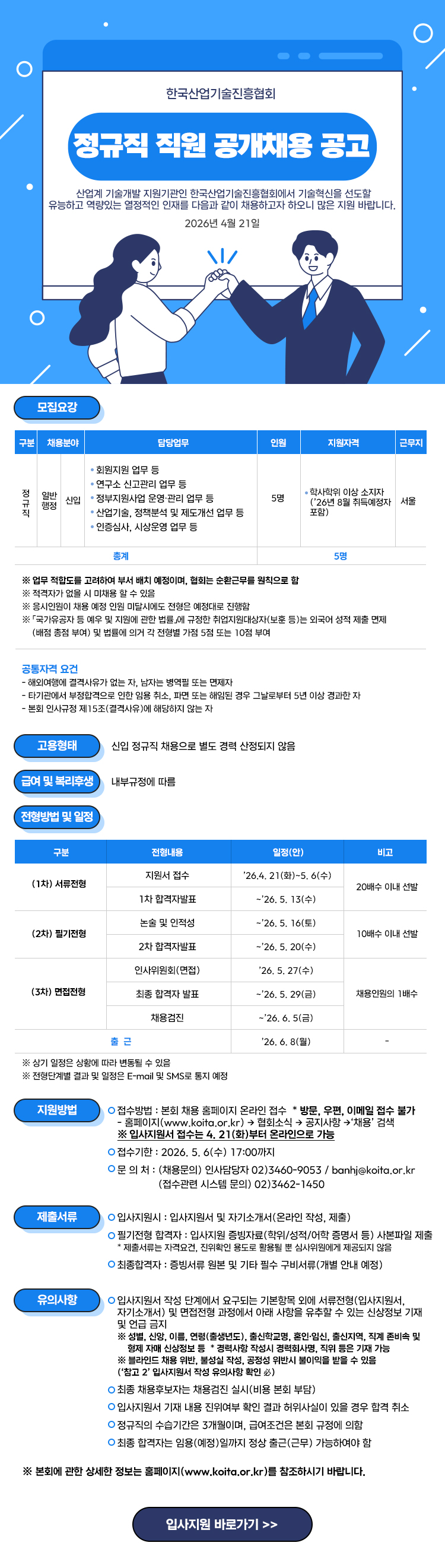 | [채용] 2026년 한국산업기술진흥협회 정규직 직원 공개채용 | |||