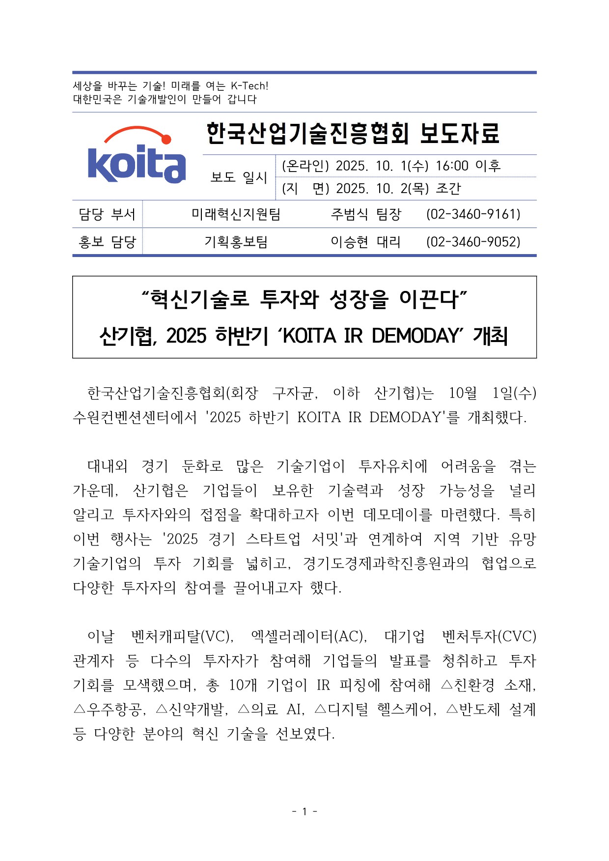 | [보도자료] 2025 하반기 KOITA IR DEMODAY 개최 | |||