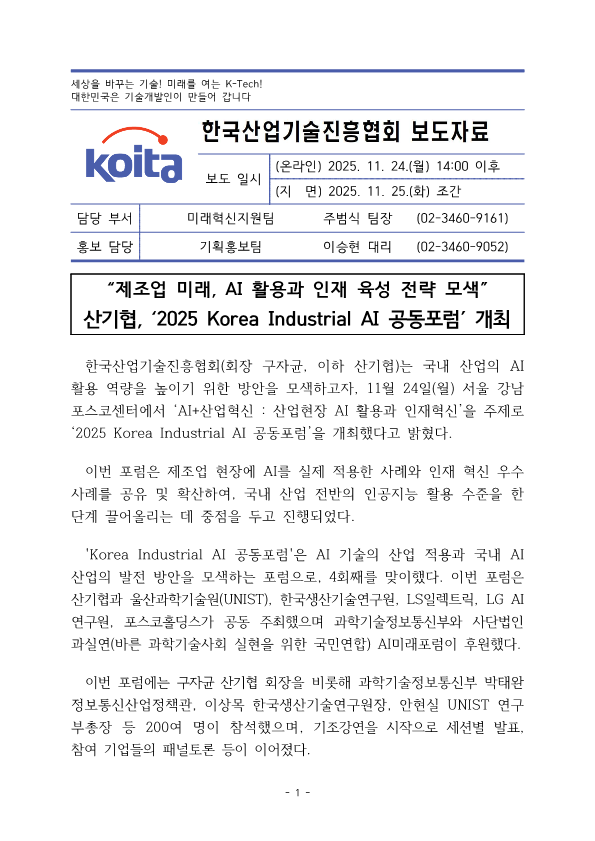 | [보도자료] 2025 Korea Industrial AI 공동포럼 개최 | |||