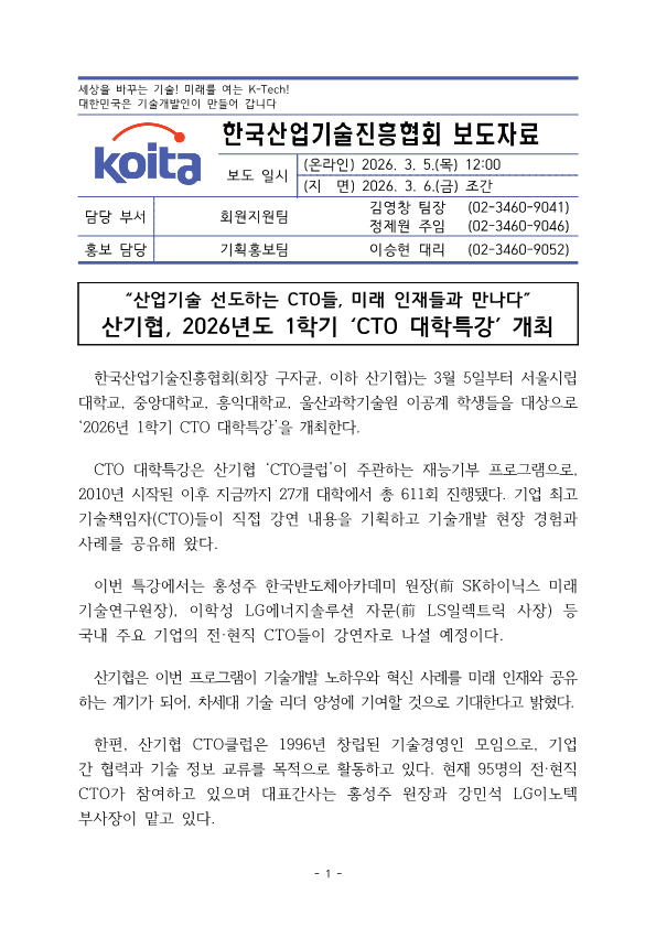 | [보도자료] 2026년도 1학기 CTO특강 개최 | |||