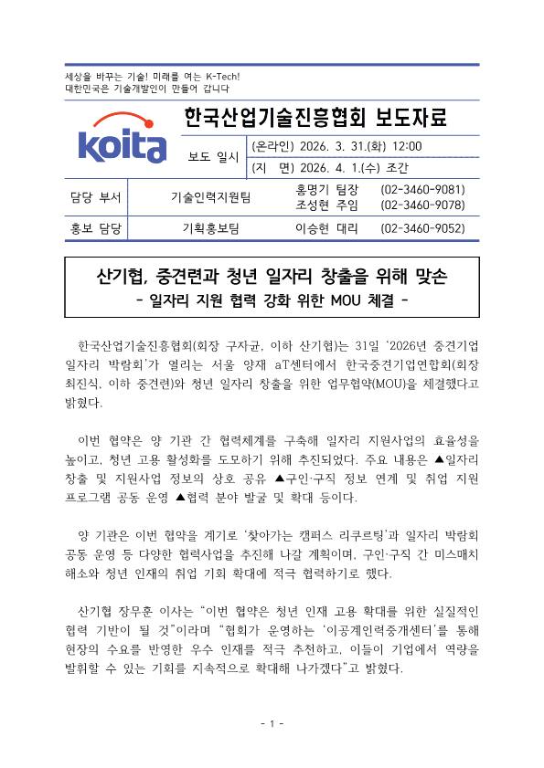 | [보도자료] 산기협-중견련 청년 일자리 창출 위한 MOU 체결 | |||