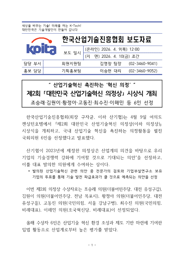 | [보도자료] 제2회 대한민국 산업기술혁신 의정상 개최 | |||