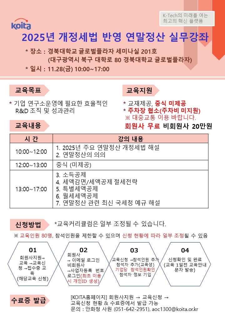 교육정보 교육정보 : 교육명, 장소, 일시, 금액, 담당자, 연락처, 참석가능 인원 [영남권] 2025년 개정세법 반영 연말정산 실무강좌 교육명 교육명 [영남권] 2025년 개정세법 반영 연말정산 실무강좌 장소 장소 경북대학교 글로벌플라자 세미나실 201호 (대구광역시 북구 대학로 80 경북대학교 글로벌플라자) 일시 일시 2025-11-28 10:00~17:00 금액 금액 비회원 : 200,000원 / 회원 : 무료 담당자 담당자 안화정 연락처 연락처 051-642-2951 정원 정원 80 명 교육설명 교육설명 내용 목록 신청하기