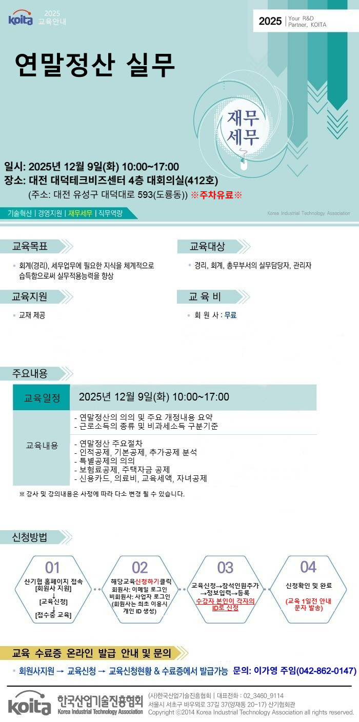 교육정보 교육정보 : 교육명, 장소, 일시, 금액, 담당자, 연락처, 참석가능 인원 [충청권] 연말정산 실무 교육명 교육명 [충청권] 연말정산 실무 장소 장소 대전 대덕테크비즈센터 대회의실(412호) 일시 일시 2025-12-09 10:00~17:00 금액 금액 비회원 : 200,000원 / 회원 : 무료 담당자 담당자 이가영 연락처 연락처 042-862-0147 정원 정원 50 명 교육설명 교육설명 내용 목록 신청하기