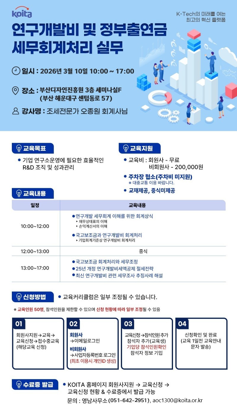 교육정보 교육정보 : 교육명, 장소, 일시, 금액, 담당자, 연락처, 참석가능 인원 [영남권] 연구개발비 및 정부출연금 세무회계 처리 실무(부산) 교육명 교육명 [영남권] 연구개발비 및 정부출연금 세무회계 처리 실무(부산) 장소 장소 부산디자인진흥원 3층 세미나실F(부산 해운대구 센텀동로 57) 일시 일시 2026-03-10 10:00~17:00 금액 금액 비회원 : 200,000원 / 회원 : 무료 담당자 담당자 안화정 연락처 연락처 051-642-2951 정원 정원 50 명 교육설명 교육설명 내용 목록 신청하기