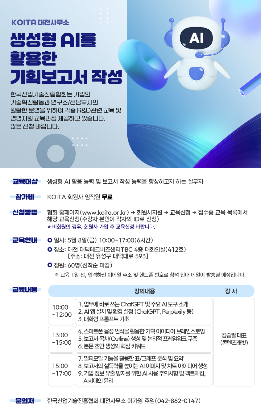 교육정보 교육정보 : 교육명, 장소, 일시, 금액, 담당자, 연락처, 참석가능 인원 [충청권] 생성형 AI를 활용한 기획보고서 작성 교육명 교육명 [충청권] 생성형 AI를 활용한 기획보고서 작성 장소 장소 대전 대덕테크비즈센터 대회의실(412호) 일시 일시 2026-05-08 10:00~17:00 금액 금액 비회원 : - / 회원 : 무료 담당자 담당자 이가영 연락처 연락처 042-862-0147 정원 정원 60 명 교육설명 교육설명 내용 목록 신청하기