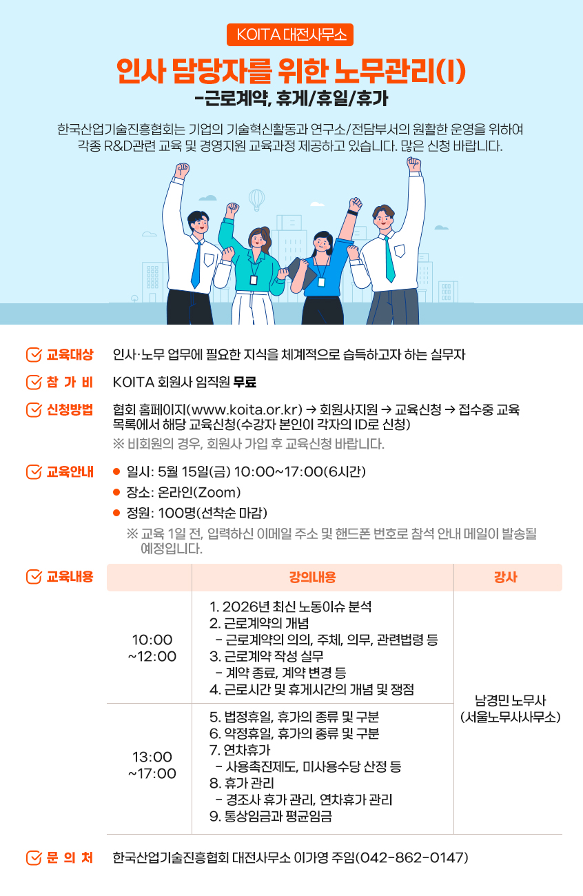 교육정보 교육정보 : 교육명, 장소, 일시, 금액, 담당자, 연락처, 참석가능 인원 [온라인] 인사 담당자를 위한 노무관리(Ⅰ)-근로계약, 휴게/휴일/휴가 교육명 교육명 [온라인] 인사 담당자를 위한 노무관리(Ⅰ)-근로계약, 휴게/휴일/휴가 장소 장소 온라인(Zoom) 일시 일시 2026-05-15 10:00~17:00 금액 금액 비회원 : - / 회원 : 무료 담당자 담당자 이가영 연락처 연락처 042-862-0147 정원 정원 100 명 교육설명 교육설명 내용 목록 신청하기