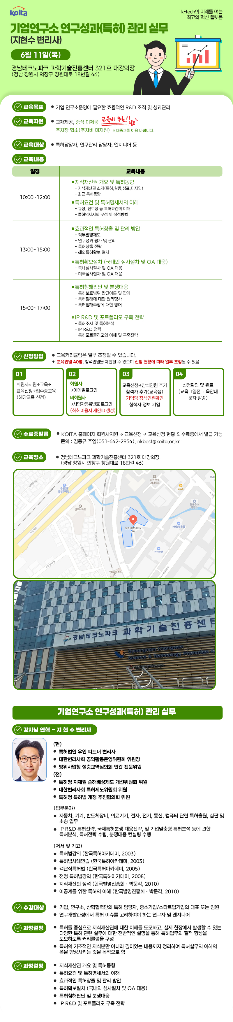 교육정보 교육정보 : 교육명, 장소, 일시, 금액, 담당자, 연락처, 참석가능 인원 [영남권] (정부지원)기업연구소 연구성과(특허) 관리 실무 교육명 교육명 [영남권] (정부지원)기업연구소 연구성과(특허) 관리 실무 장소 장소 경남테크노파크 과학기술진흥센터 321호 대강의장(경남 창원시 의창구 창원대로 18번길 46) 일시 일시 2026-06-11 10:00~17:00 금액 금액 비회원 : 무료 / 회원 : 무료 담당자 담당자 김동규 연락처 연락처 051-642-2954 정원 정원 40 명 교육설명 교육설명 내용 목록 신청하기